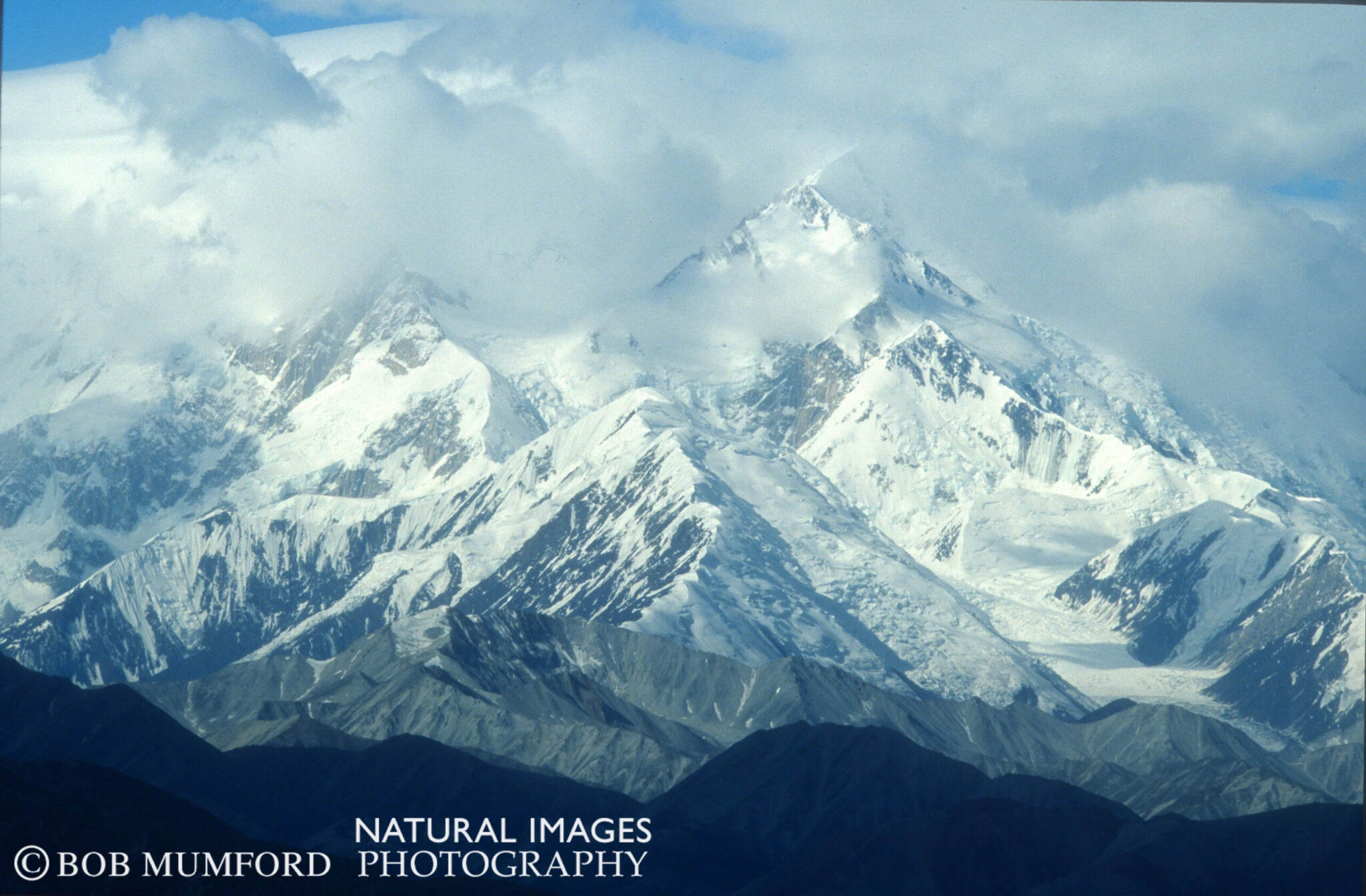 At 20,320 feet, the highest peak in North America, Mt. McKinley lies soley in Denali National Park. It is often obscured by clouds, particularly in the summer when most tourists are in the park. I was fortunate to find it quite clear one morning while taking the bus to Wonder Lake at the end of the park road.