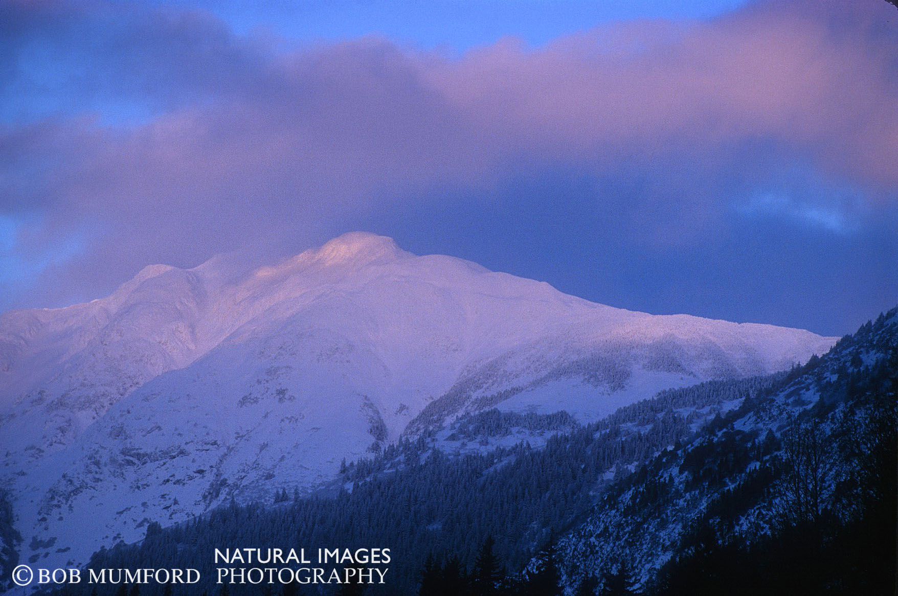 A pink sunrise on the mountains near Haines.