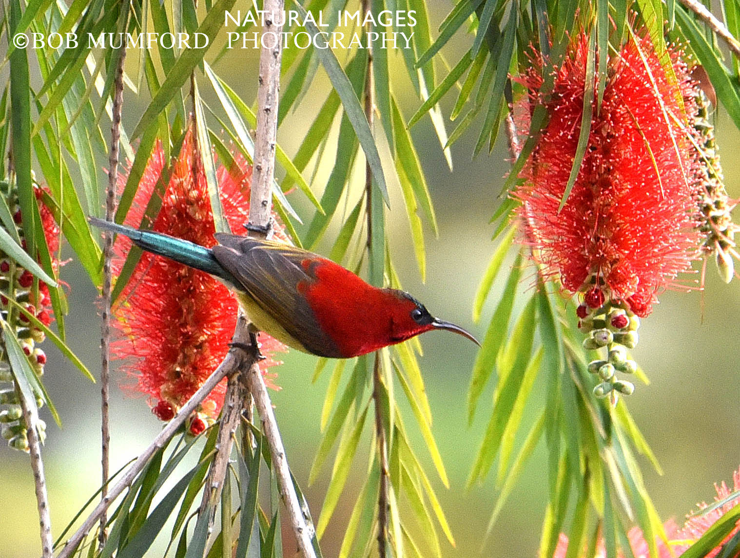 The male of this species is one of the most beautiful of the small birds in Bhutan. They were rather common in the east but not in the west. This bird was rather oblivious of the photographer, foraging on the nectar of the bottle bush.