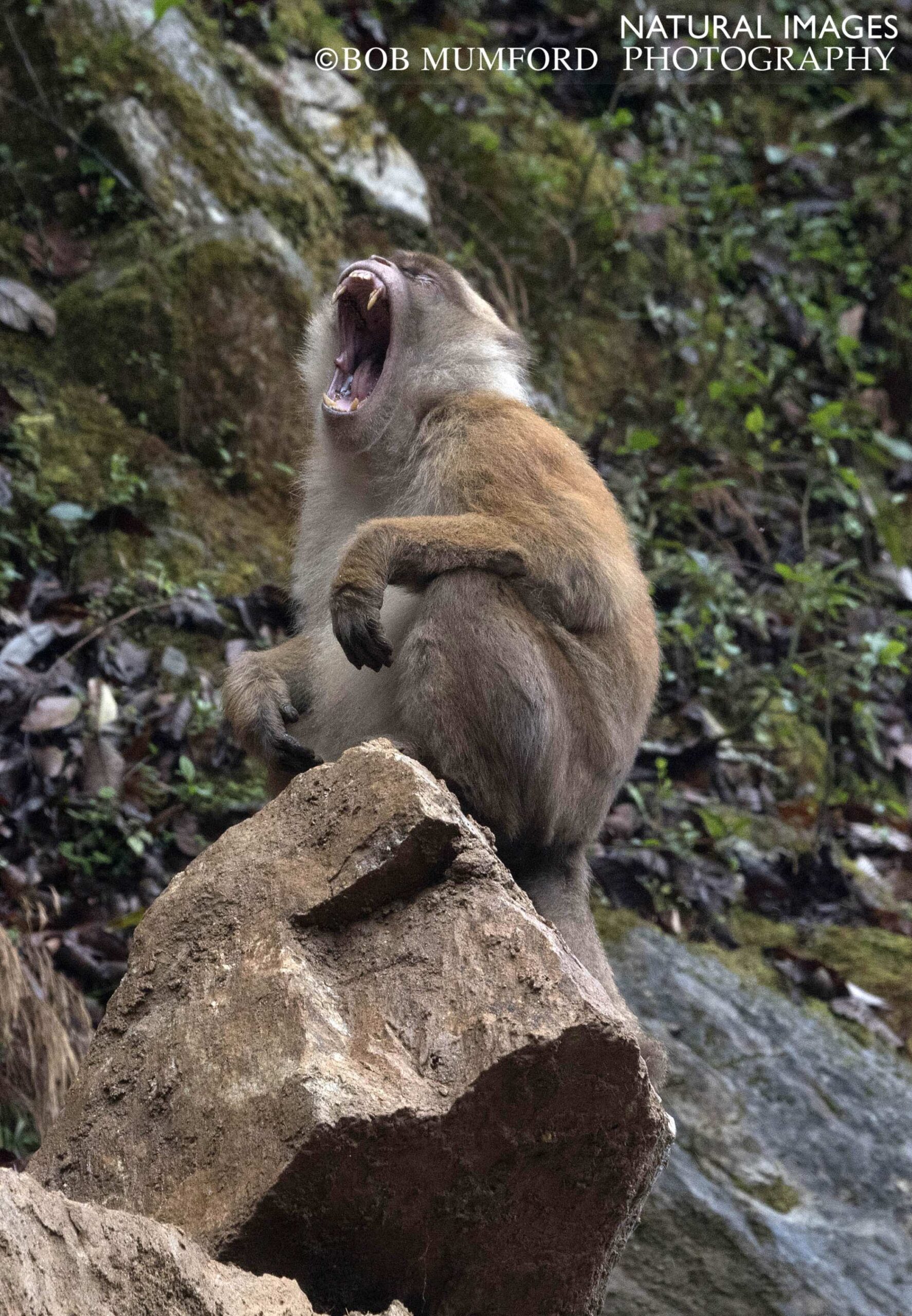 This is the most common monkey species in the country and they roam around in large herds of up to 50 animals. I think this male was the alpha male and he perched perhaps 50 feet from the edge of the road and watched his whole troop cross the road. I think he was just yawning in this photograph, not displaying for other males!