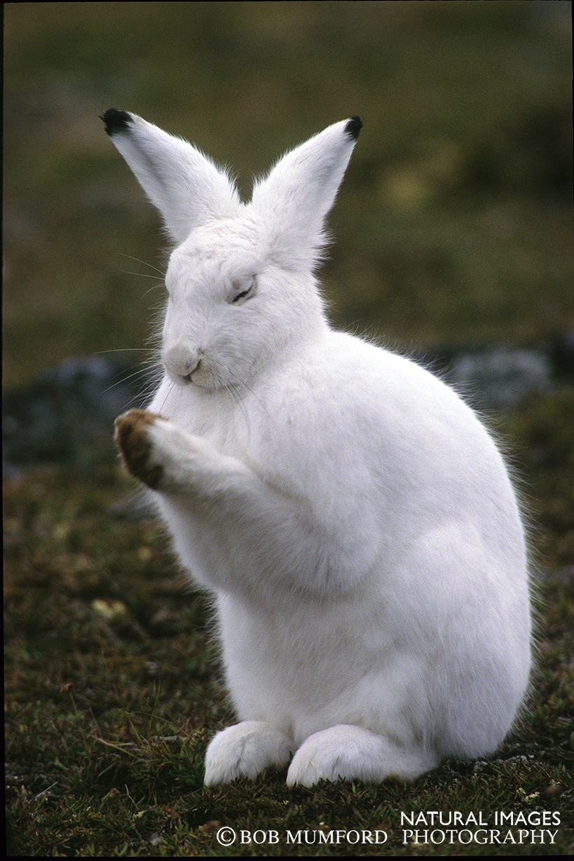 I found this animal early one morning and made over a hundred images of it as it fed and then stopped to rest in some rocks. It paid little attention to me. The problem was, it was doing nothing exciting. I had folded up my tripod and was walking away when it suddently occurred to me that I should not leave a calm animal. I returned and tried a trick I had learned in Nova Scotia: Raise both arms like a gull raising both wings, which is an alarm signal. The hare jumped up and ran maybe fifteen feet, then stopped and began cleaning itself. I kept shooting, but did not know I had this pose, where the animal appears to be praying, until I saw the slide a few weeks later.