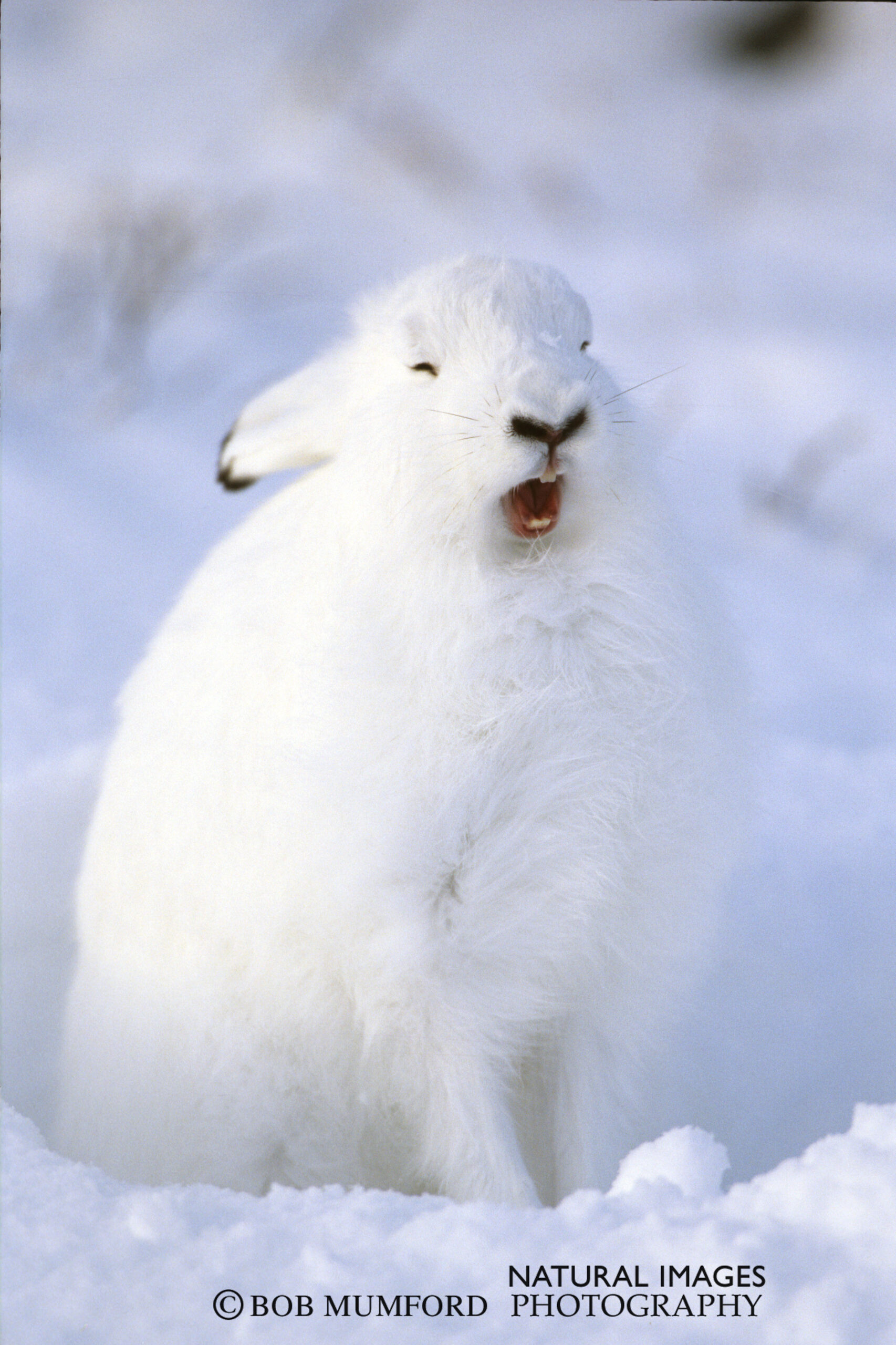 I watched this animal hop across the snow on Cape Merry and dig out a depression for the night. I photographed it as it settled into the depression when suddenly it sat up and yawned. This image was a winner in the National Wildlife Federation's 2003 international contest.