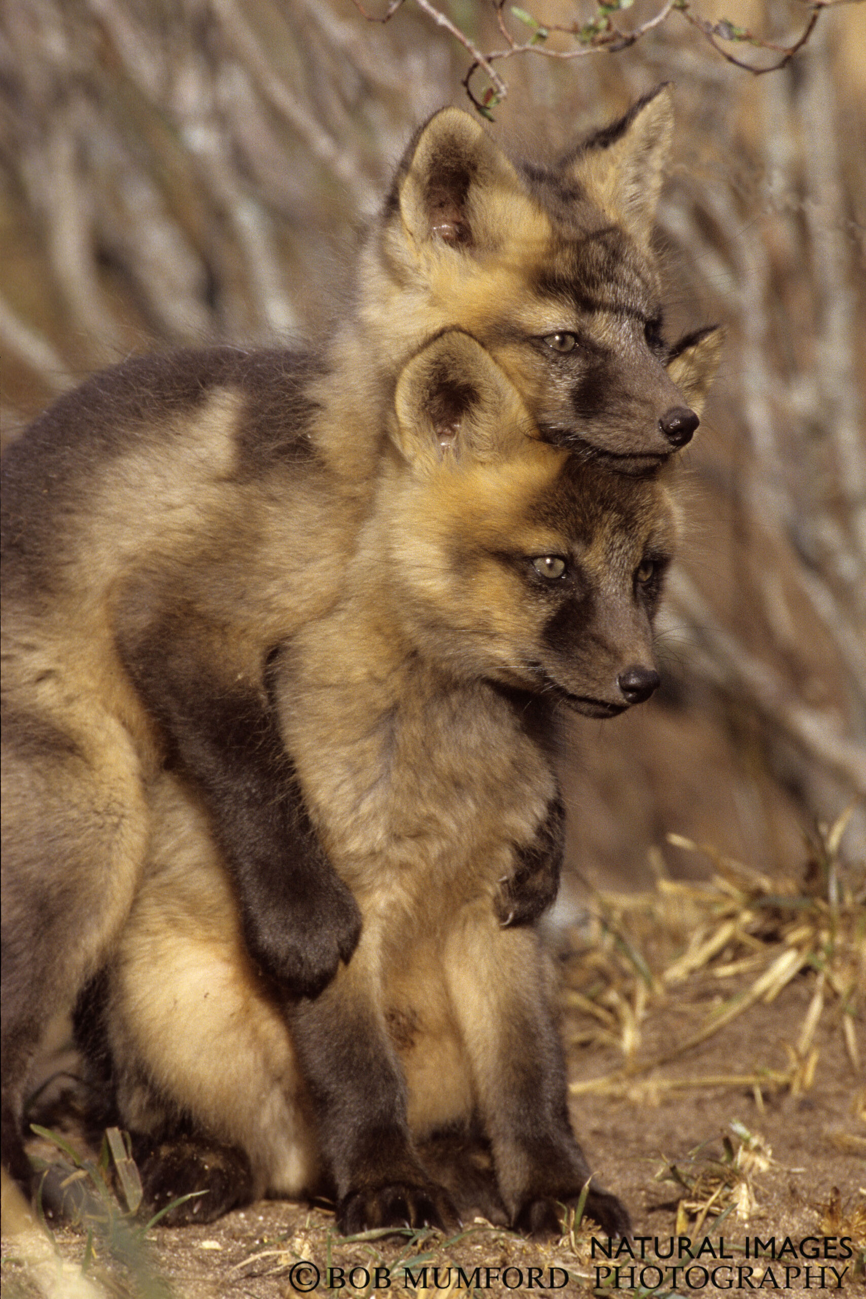 Litter mates of the black pup in photo in number 1, these two red foxes are called 'cross' foxes, because of the color pattern across their backs. Playing and tumbling in the grass are part of growing up.