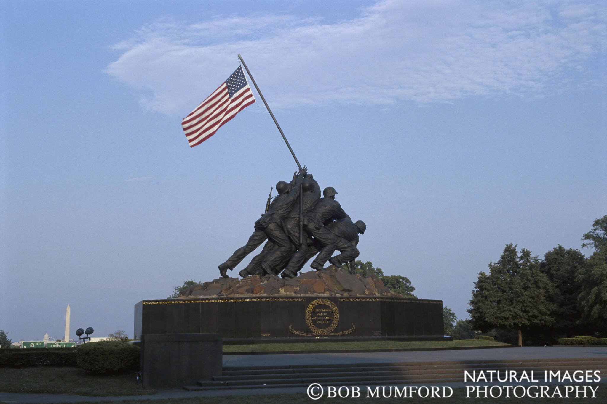 During World War II, U.S. Marines captured the tiny island of Iwo Jima, some 660 miles south of Tokyo. Famed war photographer Joe Rosenthal caught the flag being raised on Mt. Suribachi in what became probably the most famous photograph of the war. The 78 foot tall statue was dedicated on November 10, 1954, the 179th anniverary of the USMC. It sits on a hill in Arlington, overlooking the city, adjacent to Arlington National Cemetery.