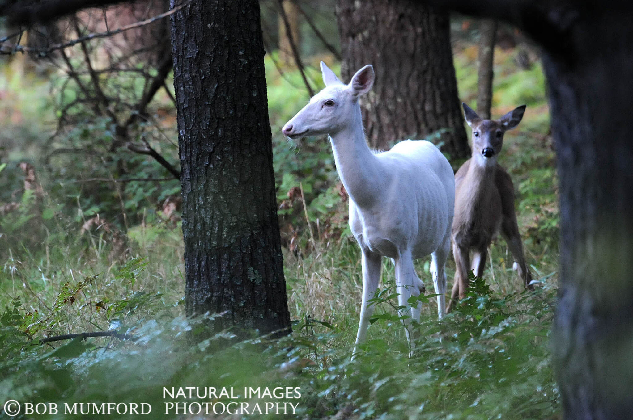 The normal colored fawn was hanging out with this albino doe as we watched them for some time. It is not clear whether the doe was the fawn's mother. Albinos often produce normal colored fawns when mated with a normal colored buck.