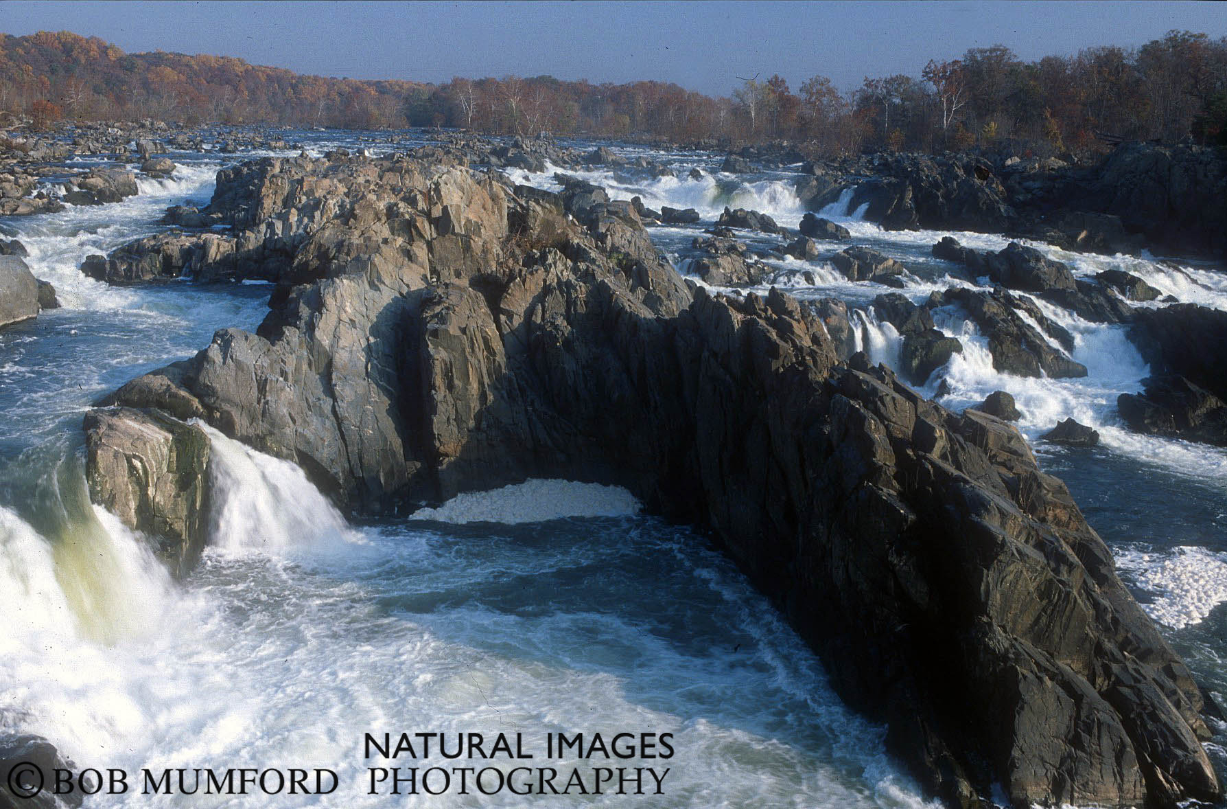 A strongly flowing Potomac River viewed from Great Falls Park, a small, 800 acre park that was acquired by the National Park Service in 1966. This view is from the Virginia side of the river, but the falls can also be viewed from an overlook near Potomac in Maryland.