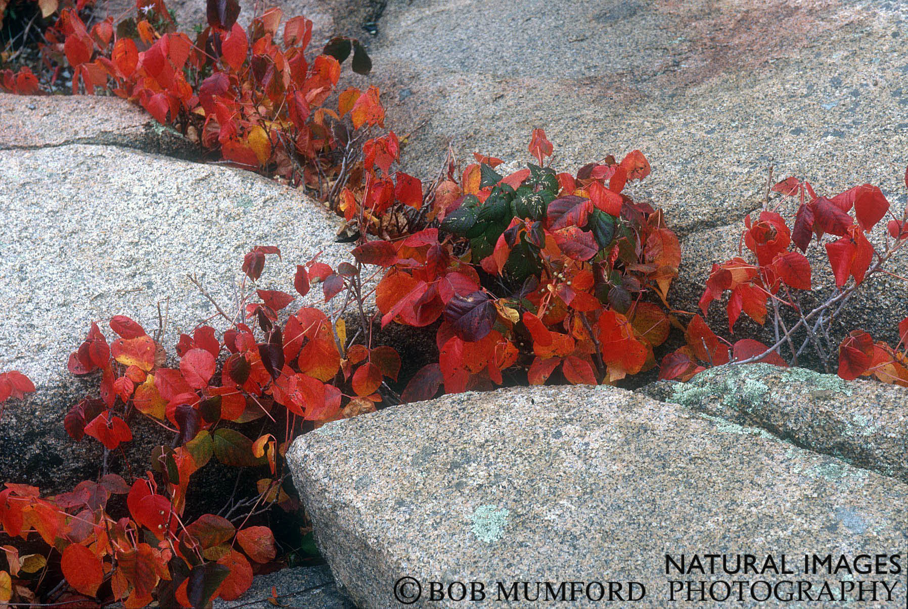 Bright red fall colored Poison Ivy amidst the rocks along the shore of Acadia National Park, Maine.