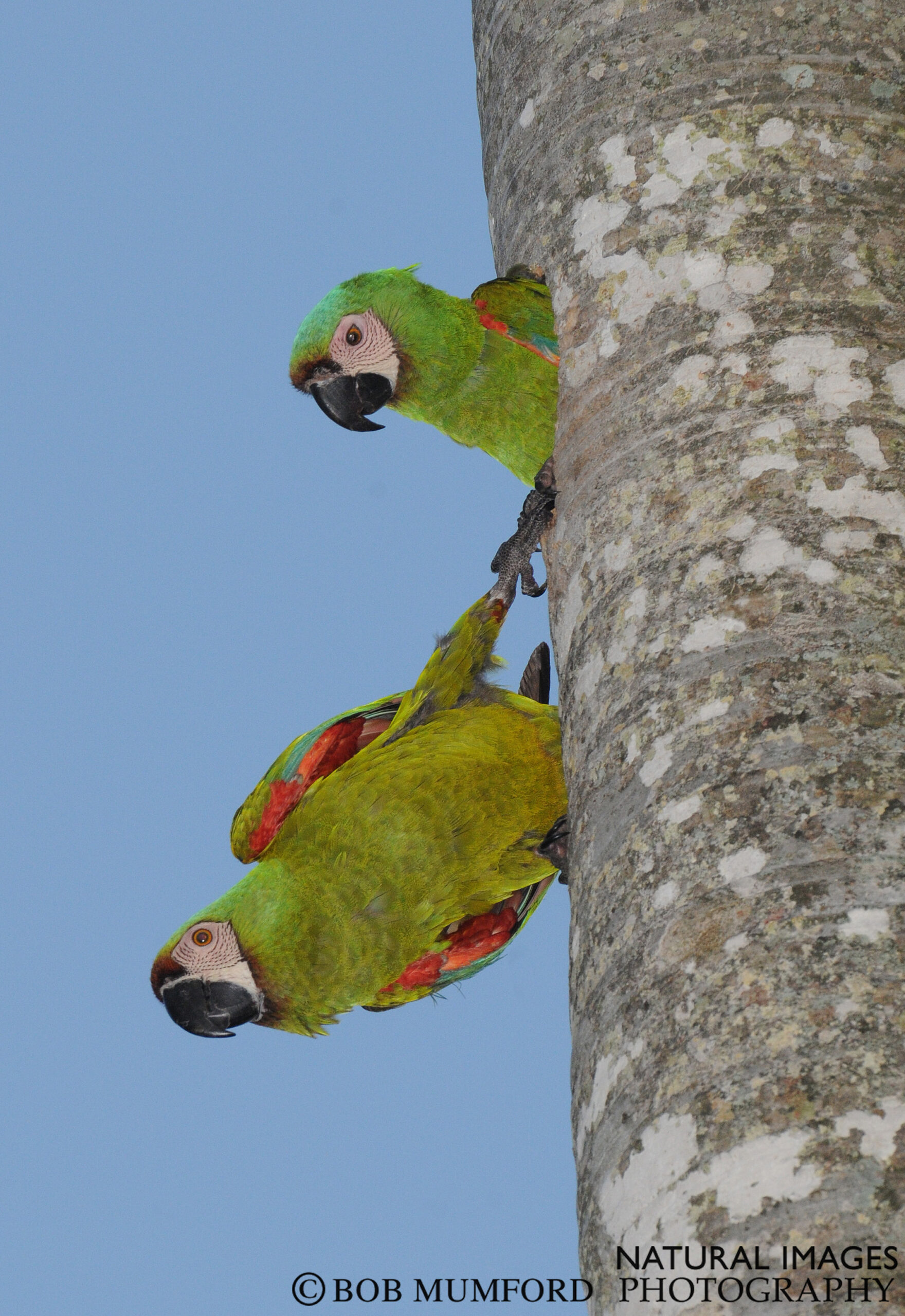 Chestnut-fronted Macaws at a nest hole in a palm tree in the undeveloped western secton of Matheson Hammock Park, south of Miami. Sadly poachers cut down this palm and others to steal chicks for the caged bird trade.