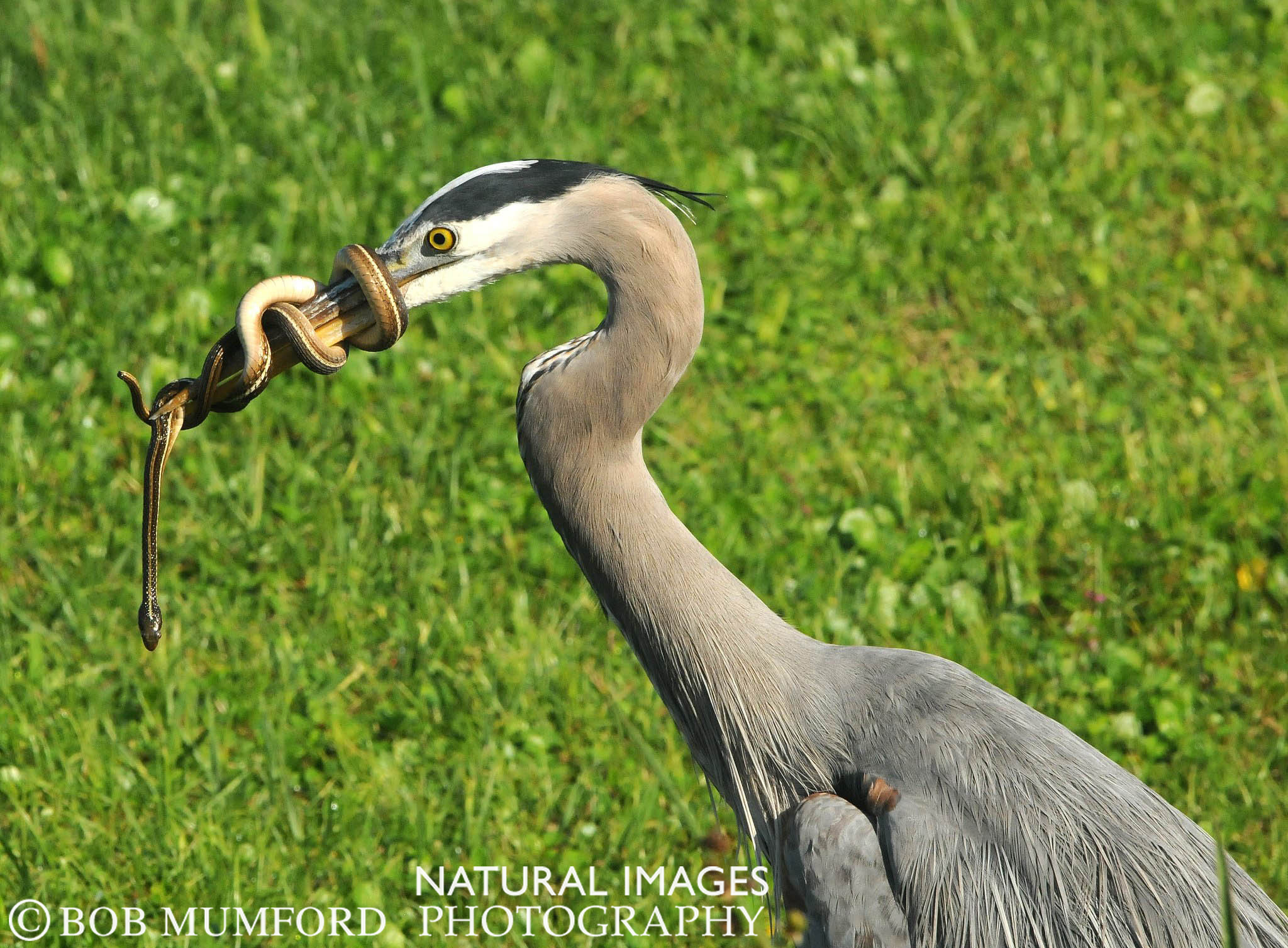 A Great Blue Heron with a snake it had captured coiled around its beak. Great Blues will eat almost anything alive, from small birds and mammals to frogs, fish and snakes. As I watched the bird killed and swallowed this snake. This image was made a Green Cay Wetlands.