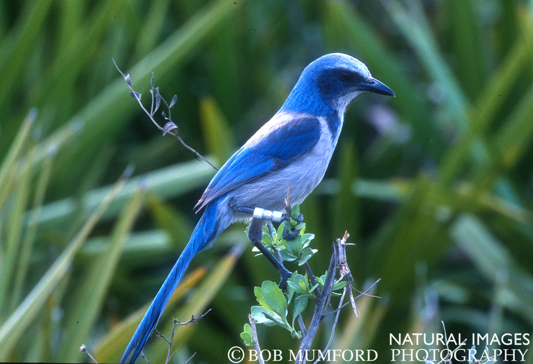 A Florida Scrub Jay at Merritt Island National Wildlife Refuge. This bird has been threatened by severe loss of habitat due to human development. It has been extensively studied and often birds spotted have distinctive legs bands to help in tracking them.