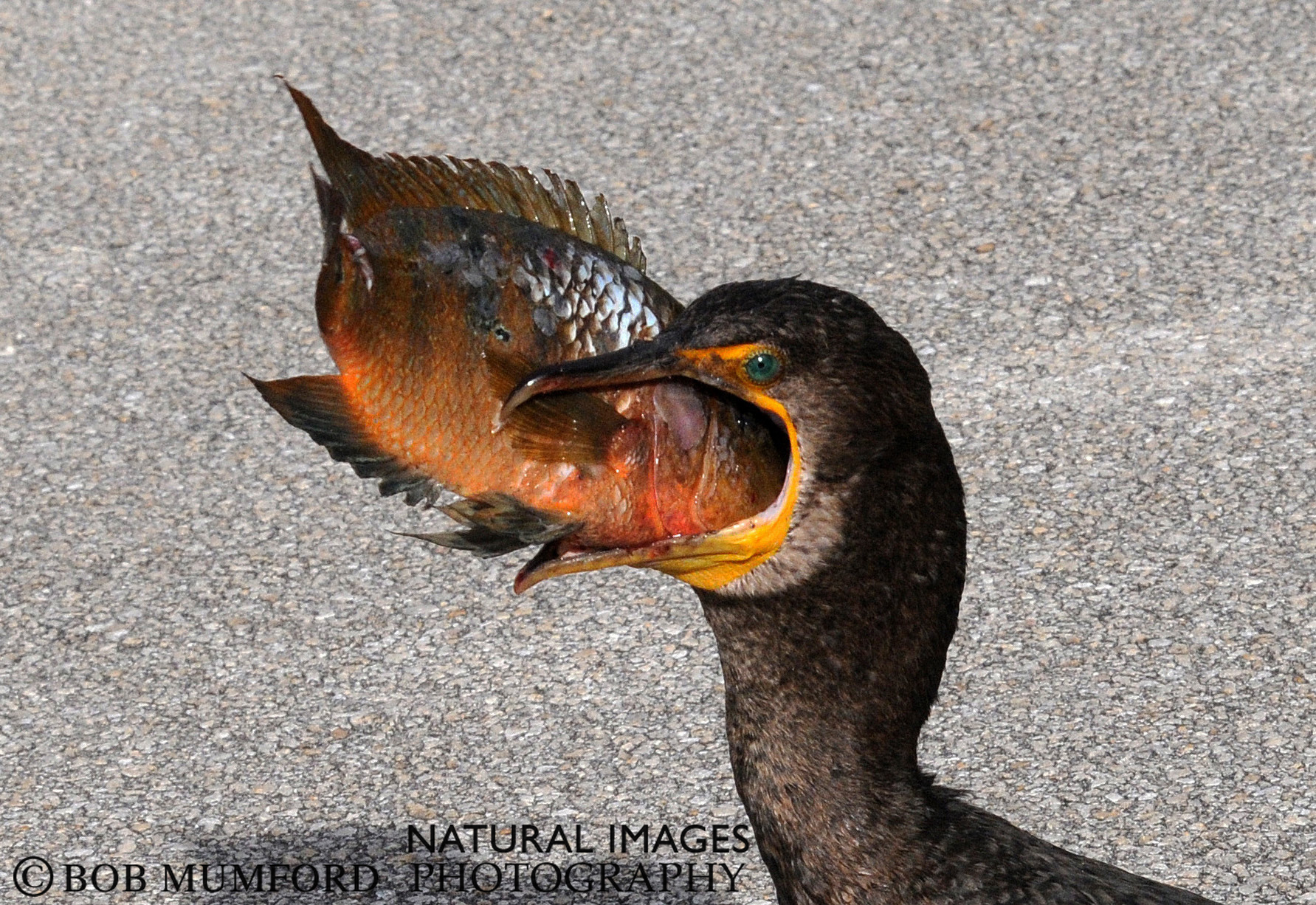 A Double-crested Cormorant at Anhinga Trail in Royal Palm Hummock in Everglades National Park with a fish that appears much too large to swallow. This was a introduced fish species, probably a type of Tilapia. And yes, after some contortions, dropping and picking up the fish multiple times, the cormie did get it swallowed!