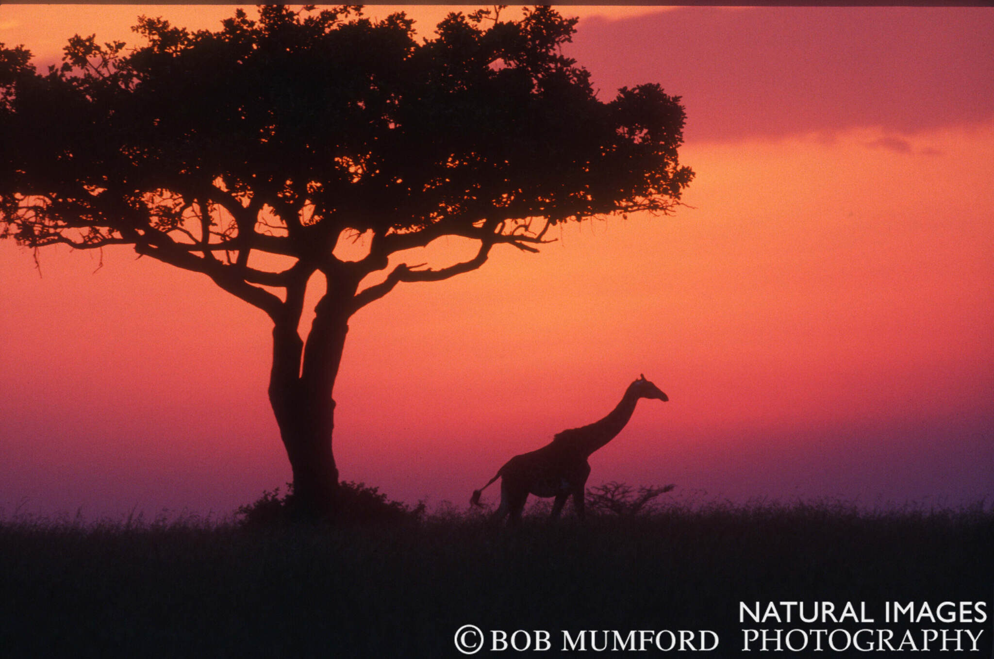 We had just broken off working two cheetahs on an impala kill, since it was time to leave the park in the evening. Turning, I saw two giraffes walking along the ridgeline against the setting sun. Directing the guide to the best angle, I was able to capture this animal adjacent to a lone tree.
