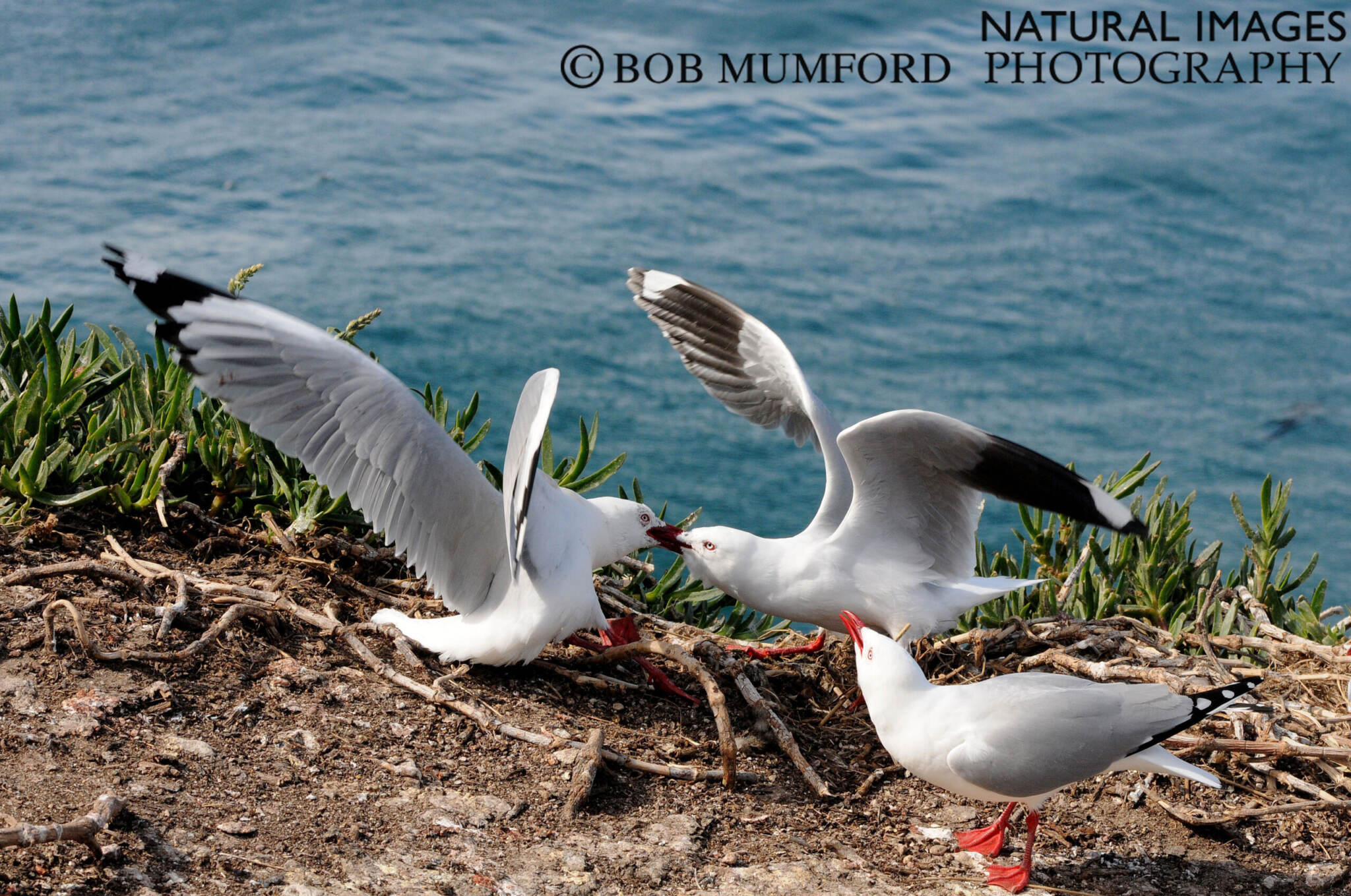 Red-billed Gulls, presumably males, fighting while another, presumably a female watches. At Otago Peninsula, South Island