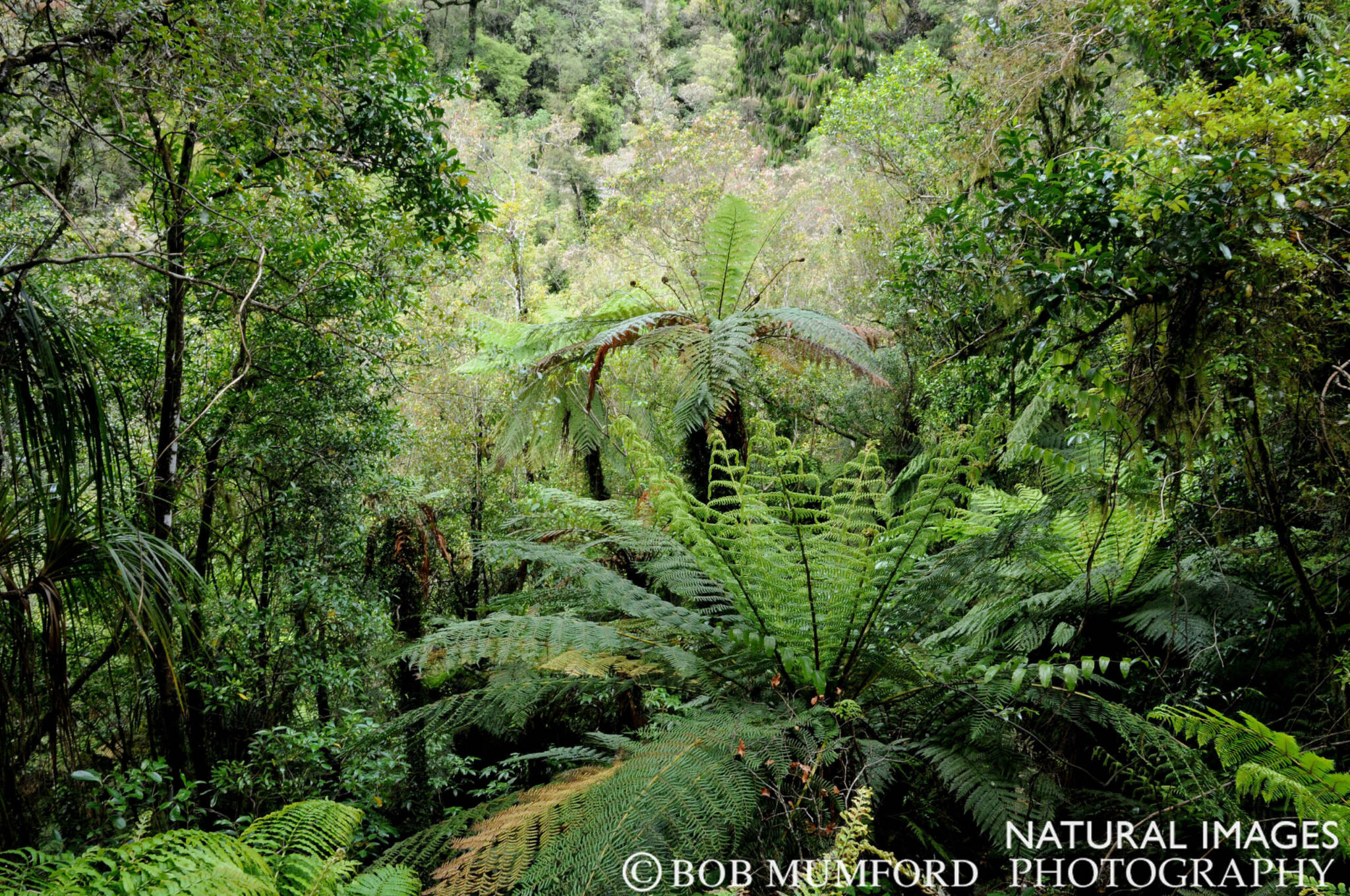 A scene of what appears to be rainforest on the trail down into Hokitika Gorge on the South Island.