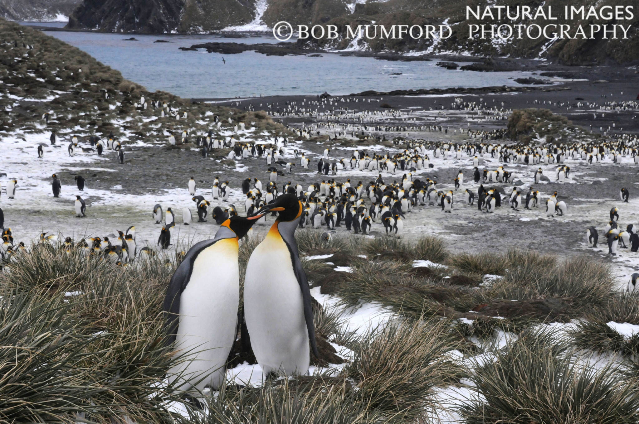 I climbed a little knoll at Right Whale Bay that overlooked the beach and the King Penguin colony.Here I watched and photographed a pair of Kings that were obviously mated as they displayed together and ate snow for moisture.