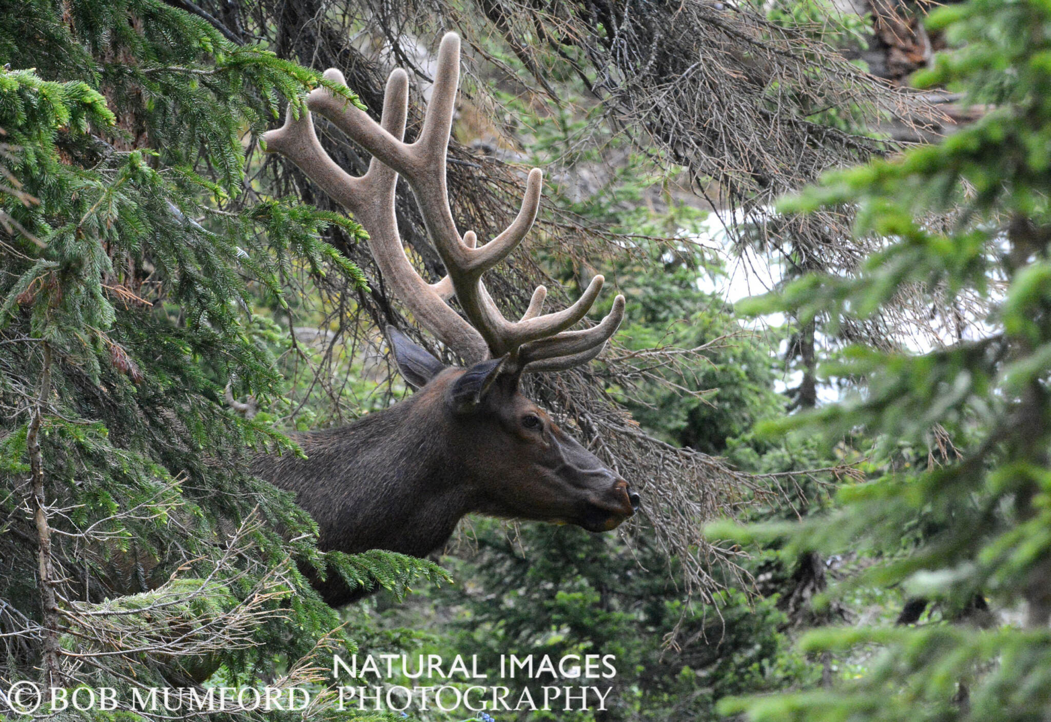 This nice bull Elk was adjacent to the road with four of his comrades. All were large animals with impressive “racks.” Their racks were covered in summer “velvet.” The elk were in heavy spruce cover, but visible from the road, not above tree line as bull elk often are found.