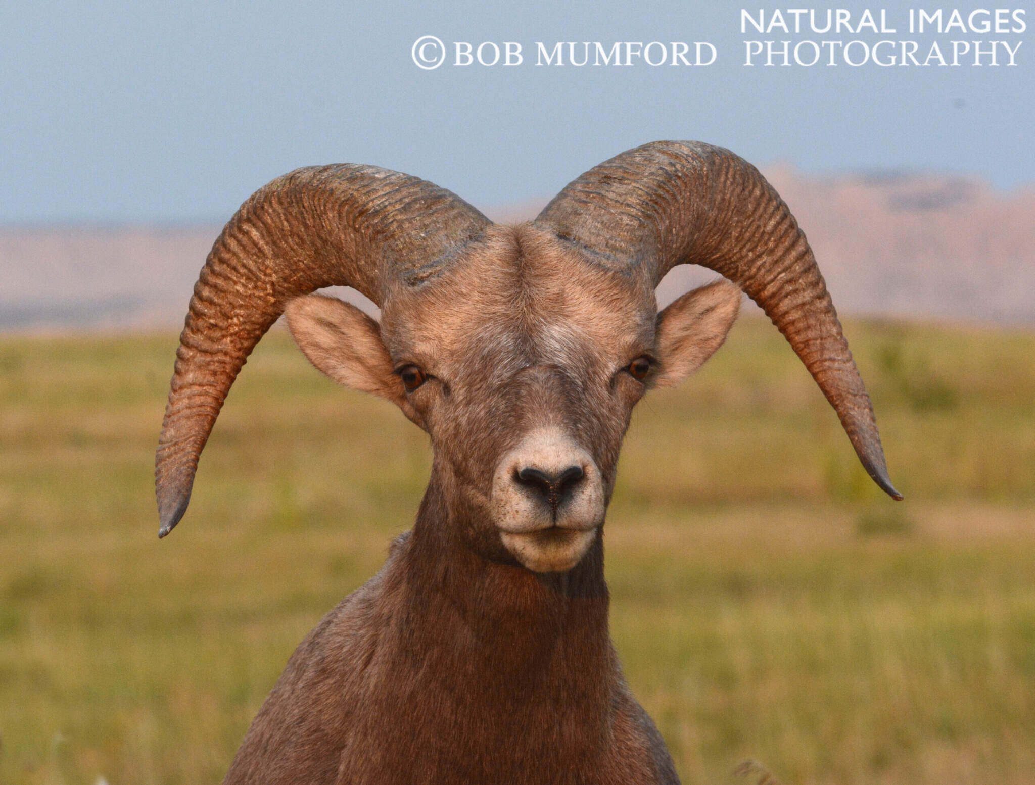 This Bighorn Sheep ram was with a harem of fifteen ewes alongside the road one morning at Badlands National Park. He and one ewe walked within six feet of my rental car, paying no attention. I was outside the car at the time. He showed little interest in the many tourists who stopped cars to watch and/or photograph.