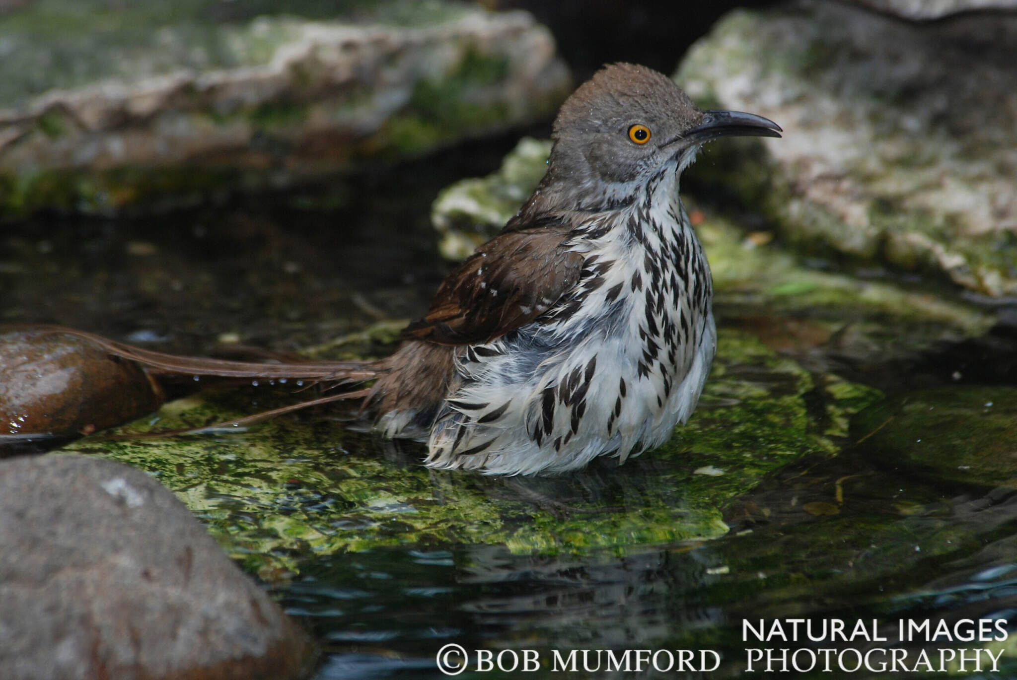 A Long-billed Thrasher taking a bath at Laguna Atascosa National Wildlife Refuge. This species is only found in south Texas in the US. It is very similar to the much more widespread Brown Thrasher that shares the habitat during the winter.