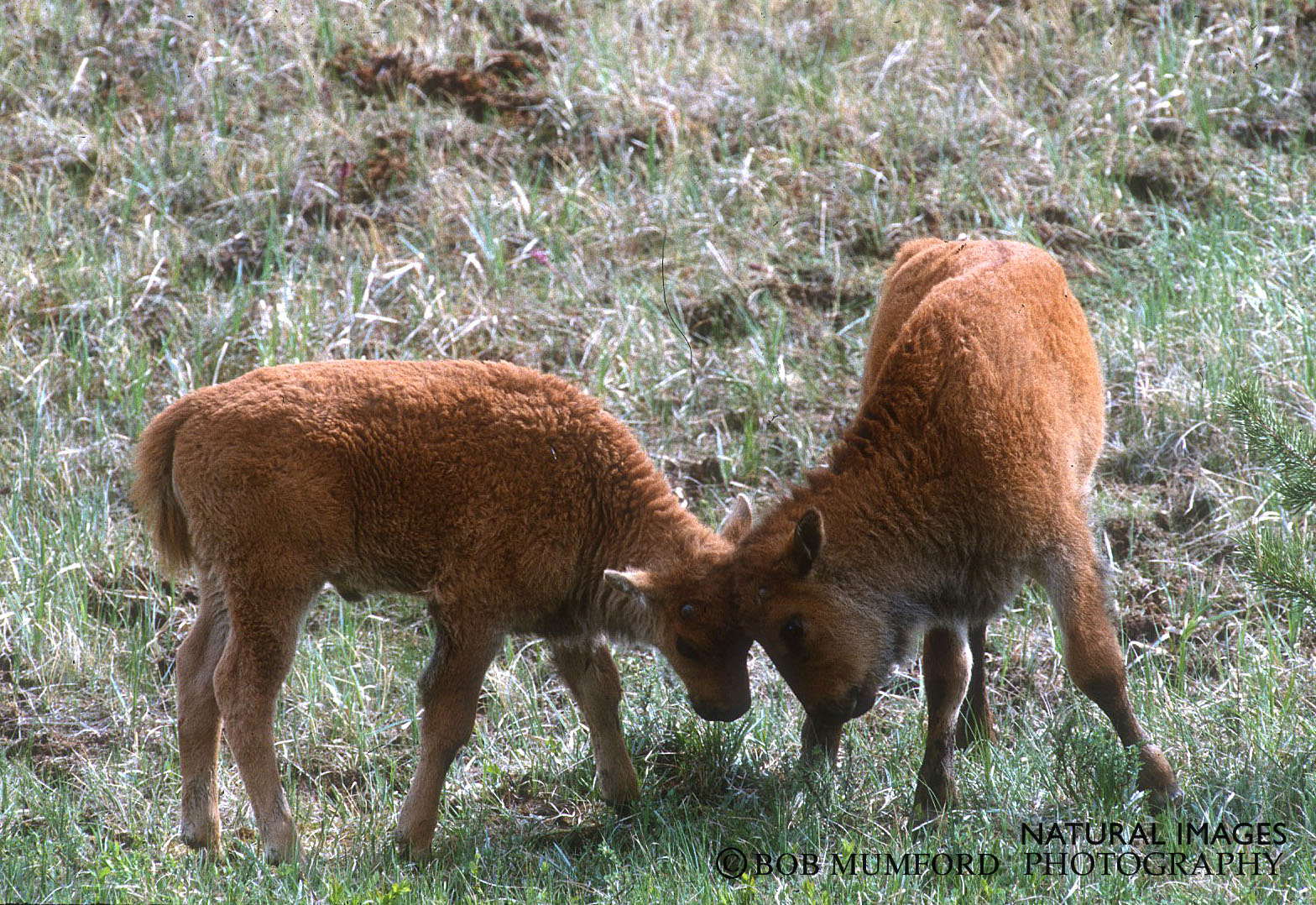 Two American Bison calves playing near their mother. Bison actually have no breeding season, so calves can be born at any time, although most are born in the spring. Their light coasts will soon molt into the traditional dark brown.