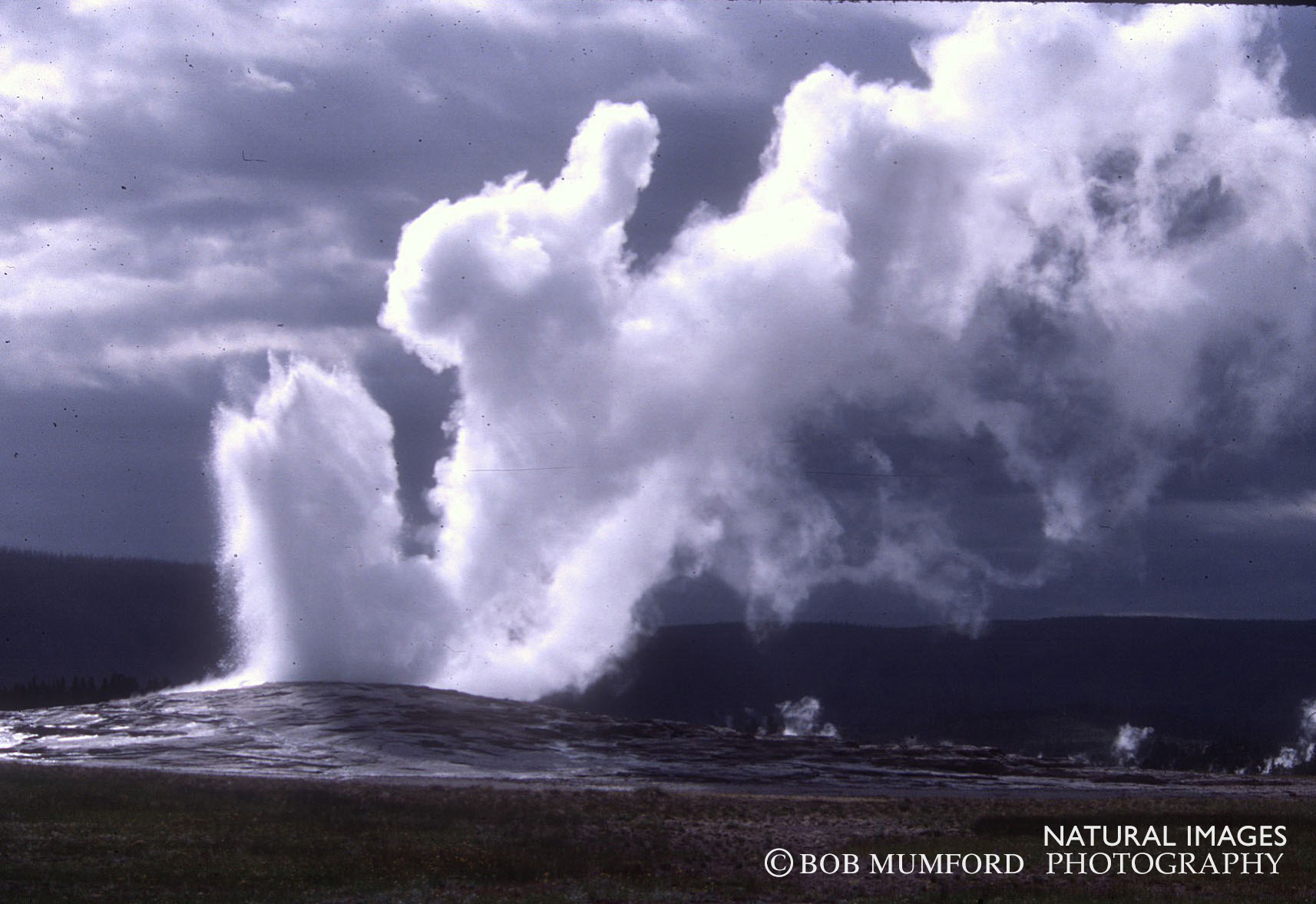 Clouds of steam following an eruption of the world famous geyser, Old Faithful. This is the quintessential feature of Yellowstone and attracts hundreds of people who can sit on benches and await the eruptions that occurs regularly about every 90 minutes. Occasionally it is much longer, the record being over nine hours between eruptions!