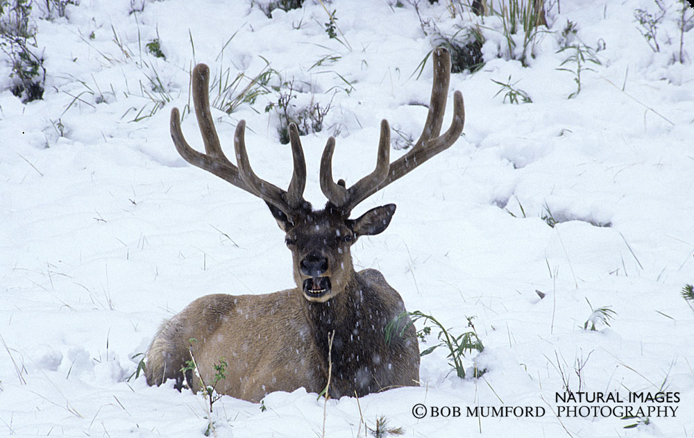 In Yellowstone, it can snow any month of the year, and this year there was an eight inch snowfall in June. This bull, with horns already large, had eaten earlier and was now bedded down, chewing its cud, seemingly unfazed by the snowfall.
